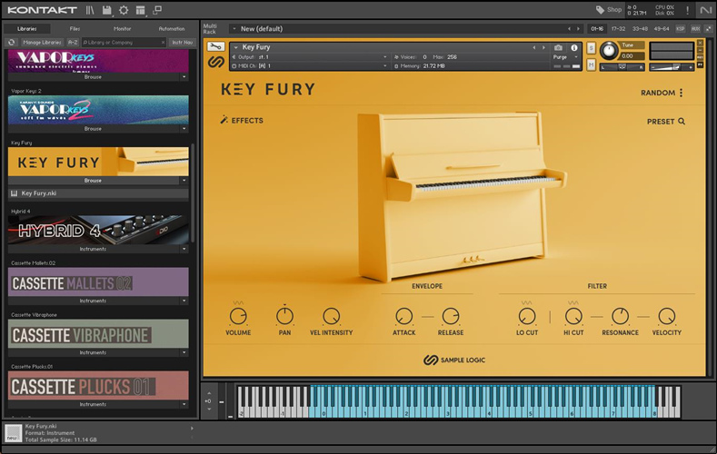 Sample Logic Key Fury KONTAKT 是一个键盘和钢琴的音色库,适用于 Kontakt 采样器。它包含了190个采样的乐器/预设,占用了12 GB的样本内容(使用了 Kontakt 的无损压缩技术)。所有的样本都是以44.1kHz/24-bit的质量提供的。