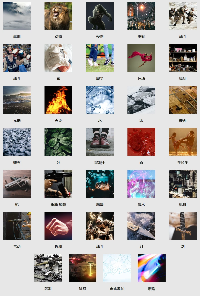 氛围/动物/怪物/剧院/战斗/布/脚步/运动/福利/元素/火灾/水/冰/表面/碎石/叶/混凝土