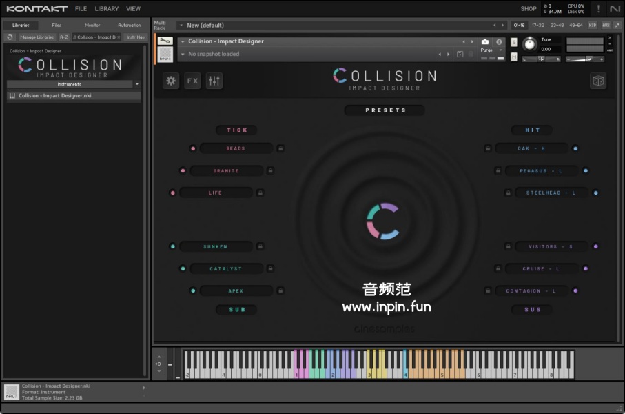 Collision Impact Designer 的声音基于原始乐器的组合,而不是单一的敲击,这为声音设计带来了独特的个性和特色。它还提供了一个MIDI映射系统,允许用户通过特定的键位触发12个声音层中的任意组合,从而提供了极大的灵活性和多样性。