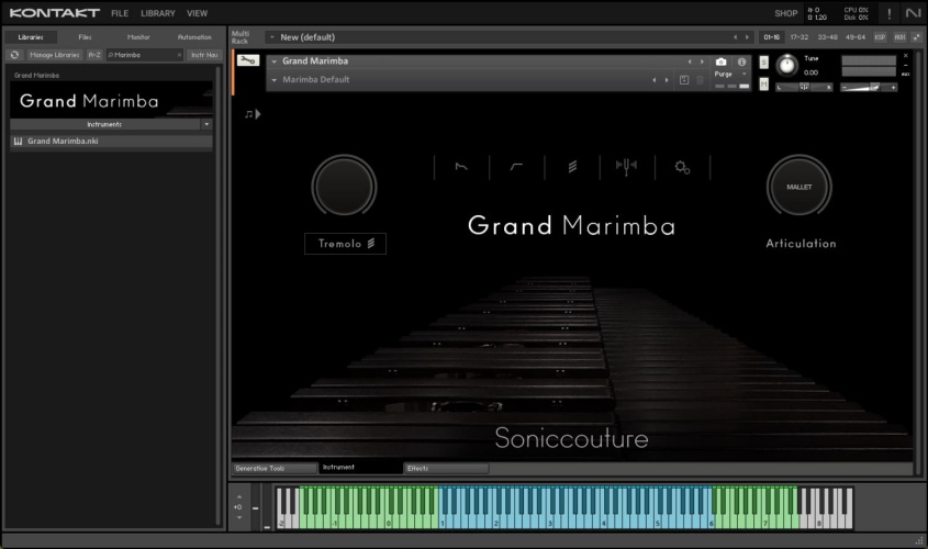 Soniccouture Grand Marimba 是一款采样马林巴琴插件,可以用于 Kontakt 或 Kontakt Player 中。它基于 Yamaha 6100 五个八度的玫瑰木马林巴琴,拥有 70 个力度层和 4 种演奏方式(木槌、棒、滚动和弓)。它还提供了多种音频处理功能,如混响、滤波、微调、限制器等,以及一个独特的 Weaver 功能,可以生成复杂的节奏延迟效果。