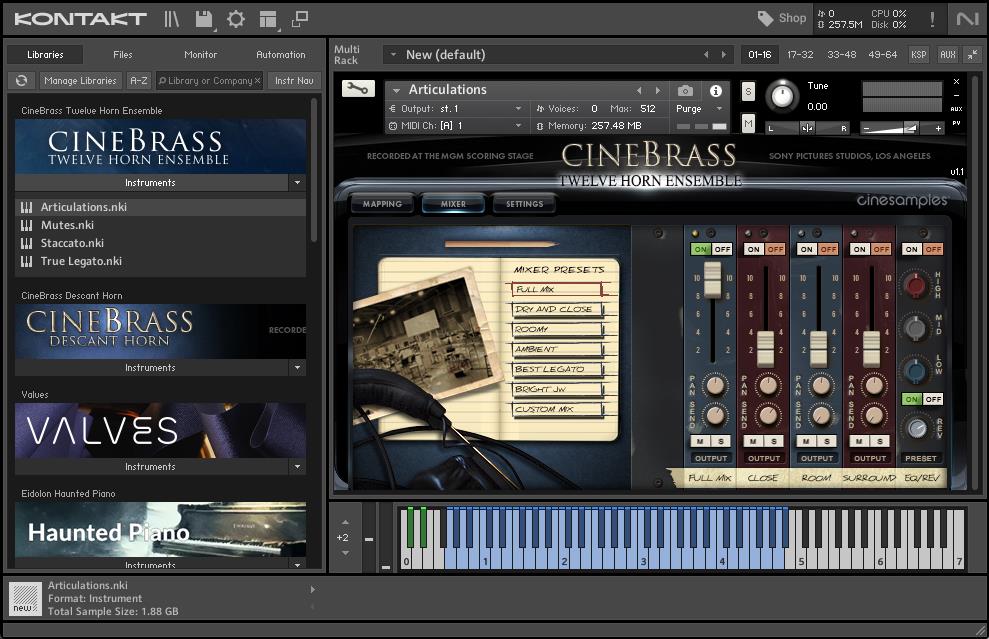 CineBrass Twelve Horn Ensemble 是 Cinesamples 公司推出的一款高音铜管乐器取样音源,也是 CineBrass 系列的扩展之一。它由 12 个法国号组成,是一个强大、明亮的高音铜管音色库。它可以作为铜管乐器的主导声音,也可以和其他铜管部分一起提供力量和亮度。它还具有真正的连奏功能,可以演奏流畅的旋律线。它是在洛杉矶 Sony Pictures Studios 的 MGM Scoring Stage 录制的,与 CineBrass 系列其他产品保持了一致的声场和品质。如果你喜欢电影配乐中的高音铜管声音,你一定会喜欢这款音源。