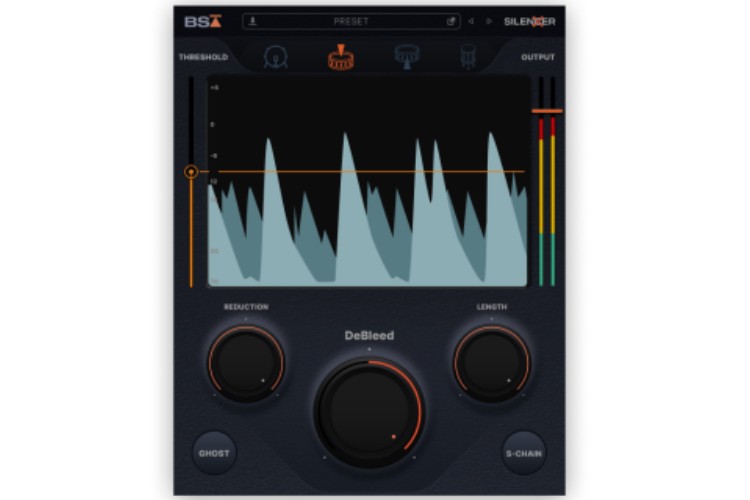 Black Salt Audio Silencer 是一款专门用于消除鼓组混音中的钹声泄露的插件。它不仅是一个普通的门限器,而是结合了一个透明和音乐感的门限器和一个先进的去泄露电路。这样,你可以去除所有令人讨厌的高频泄露,同时保留原始声音的攻击、音色和饱满度。它有四种预设的鼓模式,分别适用于小鼓上、小鼓下、踢鼓和军鼓。它还有一个幽灵音开关,可以让你在自动化时让幽灵音通过,即使低于门限值。它的界面简洁直观,可以让你在几秒钟内调出你想要的去泄露效果。