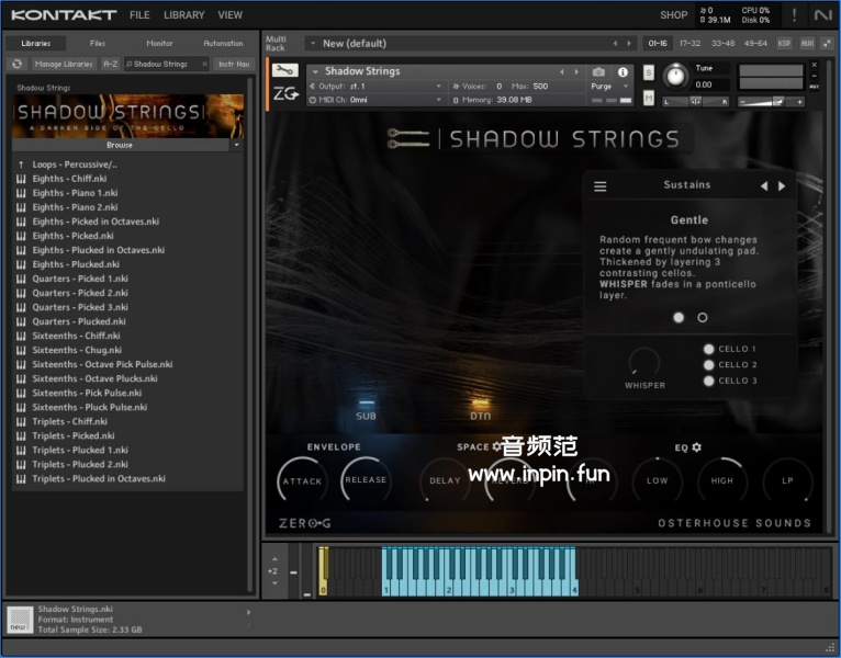 总的来说,Zero-G Shadow Strings是一个能够为您的作品增添深度和独特性的大提琴样本库。如果您正在寻找能够为您的音乐带来悬疑和神秘感的工具,这个库可能正是您需要的。希望这个介绍对您有所帮助!