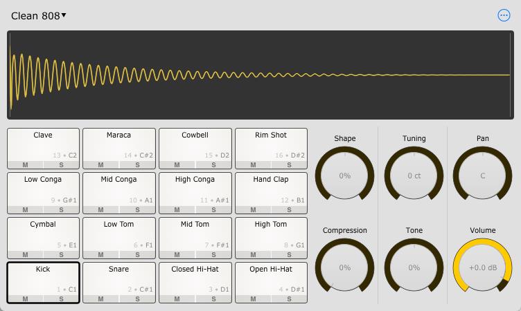 - 16个可分配的垫子:你可以使用内置的套件或自己的声音。每个样本都会被分析动态和音高,这使得控制更直观和音乐化。你可以将你创建的套件保存到用户套件库中²。