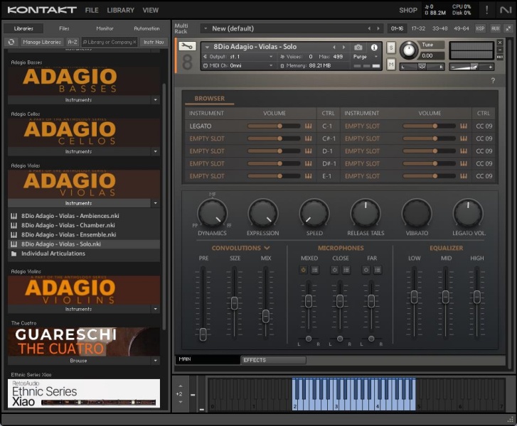 8Dio Adagio Violas 是一款专为 Kontakt VST, AU, AAX 插件格式设计的中提琴音色库。它是 8Dio Adagio 系列的一部分,包含了全套中提琴合奏(7位演奏者)、室内乐中提琴合奏(3位演奏者)以及独奏中提琴(1位演奏者)。Adagio Violas 提供了多种演奏技巧和表现力,包括多达三层响应层和三次循环重复的两种独特连奏(Legato)类型。