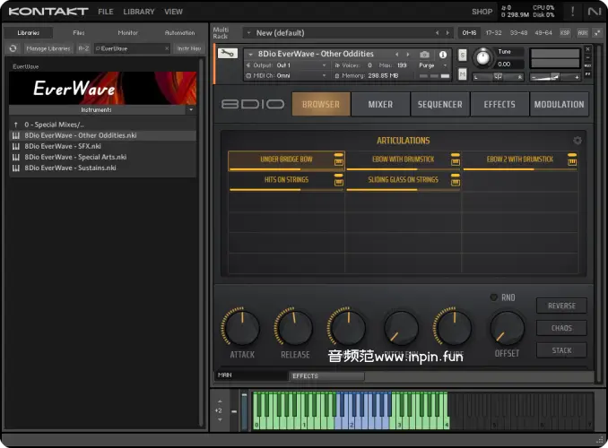 - 多样的演奏技法: EverWave 提供多种持续音(Sustains)和特殊技法,包括手指拨弦、弓奏、倒置弓奏、泛音、电子弓(Ebow)等。此外,还有使用鼓槌、金属器具和玻璃在琴弦上演奏的特殊效果音色。