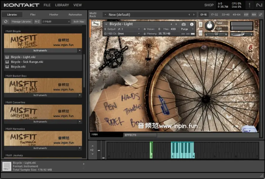 - 原型声音: Misfit Bicycle 采样库的核心是从一辆自行车上采集的各种声音。这种设计理念源于一种声音设计的探索精神,通过非传统乐器的音色,为音乐创作提供独特的声源。