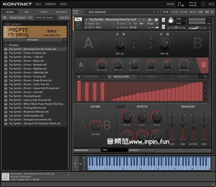 - 多样化的声音变化: Misfit Toy Synths 采样了各种经典的玩具合成器音色,如方波、锯齿波、脉冲波等,并提供了多种音色调制选项,适合用于创作多种风格的音乐。