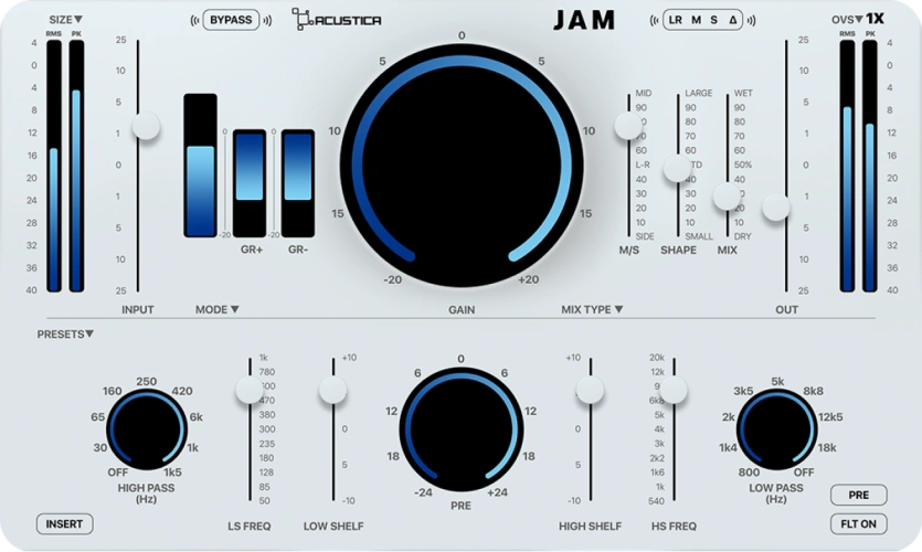 Acustica Audio Jam是一款基于采样技术和人工智能的音频插件套件,它可以为你的音乐提供无与伦比的声音温暖和特色。它包含了14种不同的高质量采样单元,25种不同的经典和现代模拟饱和效果,以及一些先进的功能,如Hyper2饱和技术,2频段Hypers EQ,HP-LP滤波器,Hyper前置放大器阶段,Shape控制,Mix Type模式,RMS和LUFS计量系统,高质量过采样,监听模式等。