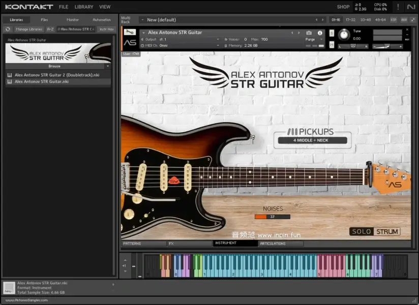 Antonovsamples Alex Antonov STR Guitar 是由 Alex Antonov 开发的乐器音源,旨在为音乐制作人和作曲家提供逼真的Stratocaster电吉他音色。该库具有“独奏”和“扫弦”模式以及 40 多种模式。 14 种类型的和弦可以在弹奏模式下使用它特别适合用于摇滚、金属、流行、和其他现代音乐风格。