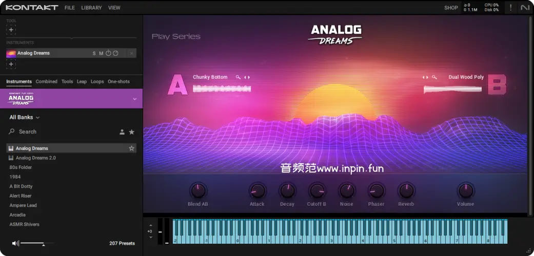 想要重现80年代新浪潮之声?又或是想在现代化音轨上增添细微的复古风味?它就是你梦寐以求的乐器音源。ANALOG DREAMS 能够将复古合成器之声和创意效果融合,制造出原创的现代音色。你可以利用深沉而震撼的 bass、丰满柔和的长音、锋锐的主奏音色、弹拨式的打击声、稀奇古怪的声音效果来唤醒新的灵感。你可以选择需要的声音源,然后通过混合与调节,创造出你幻想中的合成器之声。
