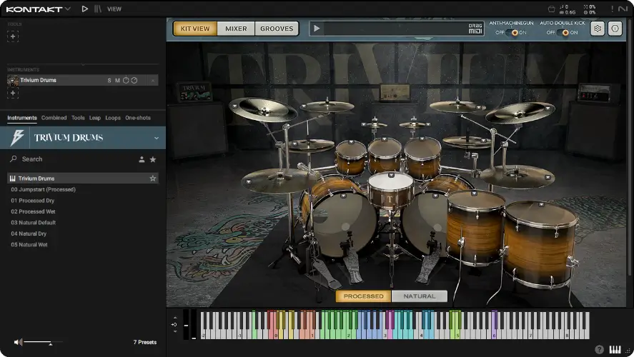打开乐器的瞬间,你就能使用由 Jens Bogren 录制混音的 Alex Bent 原汁原味鼓声。若你想自行混音,只需将模式切换至 Natural,即刻获得未处理的原始音色。