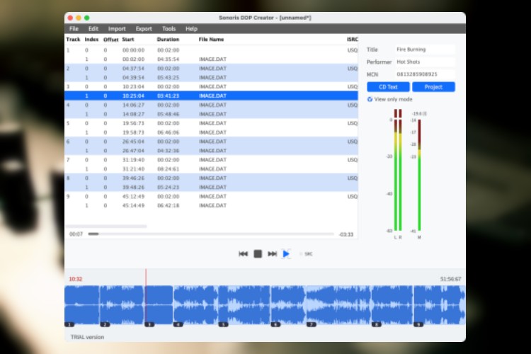 - 它可以让你导入其他软件制作的 DDP 文件集,包括 Sonic Studio HD, Sadie, Sequoia 和 Pyramix 等。这个功能可以让你检查导入项目的所有细节,包括 PQ 码、ISRC、MCN 和 CD-Text 数据。你还可以编辑项目、播放曲目并导出到 DDP、Cue Sheet 或刻录一个符合 Redbook 标准的 CD。
