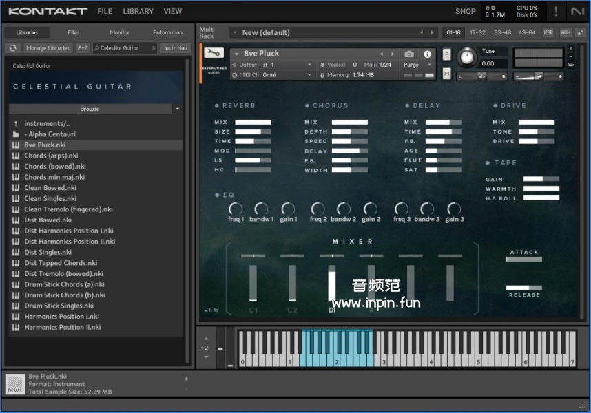Waverunner Audio的Celestial Guitar是一个虚拟乐器库,专为Native Instruments的Kontakt平台设计,旨在提供丰富、梦幻和空灵的吉他声音。这款乐器库非常适合用于电影配乐、氛围音乐以及需要独特吉他音色的音乐创作。以下是Celestial Guitar的详细介绍: