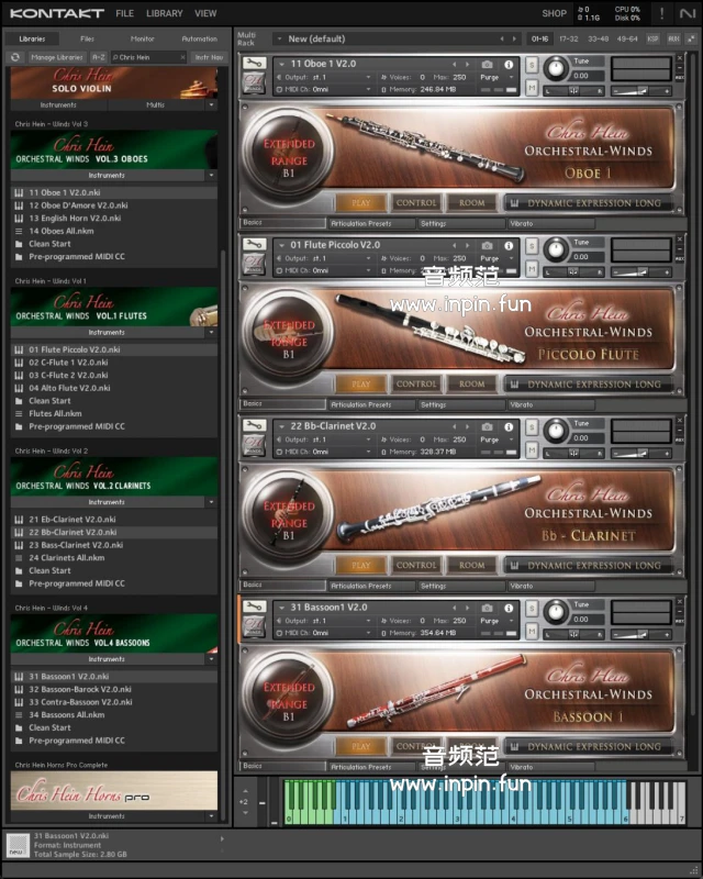 - 包括各种木管和铜管乐器,如长笛、单簧管、双簧管、巴松管、小号、长号、法式号等,每个乐器都经过精心采样,提供了丰富的演奏技巧和音色变化。