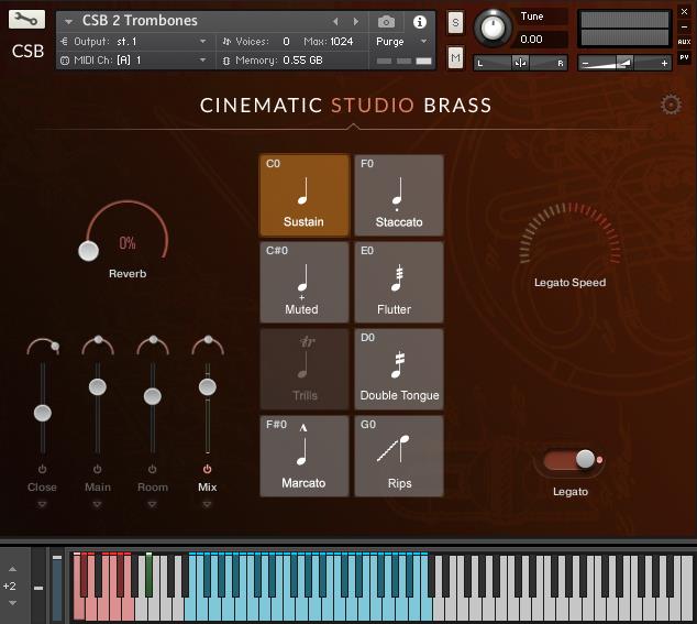 图形用户界面(GUI)精简高效,补丁程序数量最少,因此学习迅速且易于使用。布局在功能上与Cinematic Studio字符串相同,因此当然很容易单独使用,或者在同时使用两个库时同样容易。 GUI具有易于分配的按键开关和MIDI CC,以及带有输出路由选项和混响的完整混音器。为了节省内存,只需单击几下即可将链接加载到RAM中或从RAM中加载。