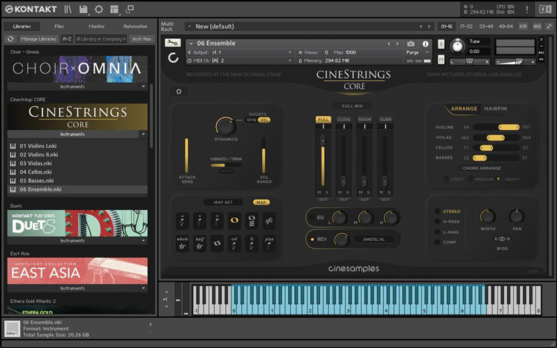 - CineStrings Core 在著名的洛杉矶索尼影视得分舞台 (Sony Pictures Scoring Stage) 录制,这里也是许多经典电影配乐的录音地。
