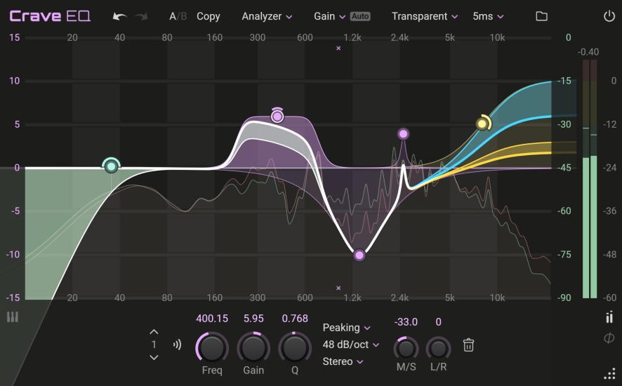 - 透明:数字魔法,将低端的平滑模拟滤波和高端的线性相位处理结合起来。提供了更加连贯的混音体验,因为高频保持了跨越轨道的相位。非常适合在跨越轨道时应用校正或创意均衡时保持混音的完整性。