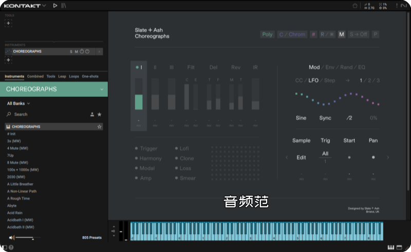 Choreographs 是 Slate + Ash 开发的一款先进声音设计与合成库,运行于 Kontakt 平台(或免费 Kontakt Player)。它是一种动态、可调节的声音发生系统,将抽象声音素材、节奏脉冲与调制逻辑结合,让声音在时间、形状与空间中“动态舞动”。该工具主要面向影视配乐、实验电子、氛围音乐、音效设计,以及需要创造性音色和动态纹理的声音艺术创作。