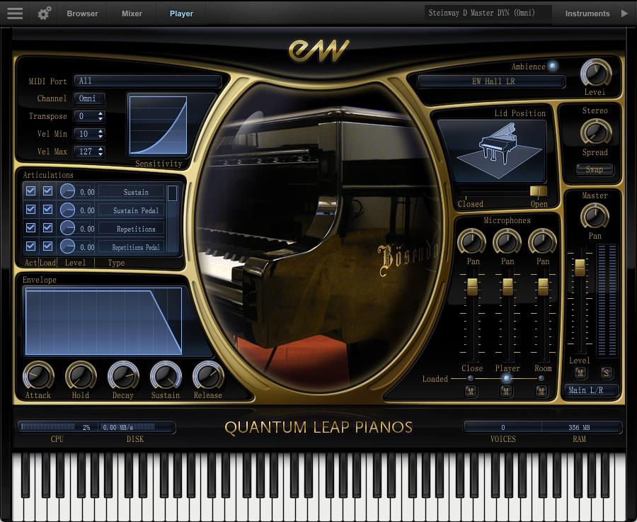 EastWest Pianos Platinum Steinway D是一个虚拟音乐软件,基于精心采样的Steinway D音乐厅钢琴。这个软件提供了10-16个力度层,八种不同的演奏技法,如静音、延音、断奏等,以及三个可混合的麦克风位置。这个软件支持独立运行或作为AAX、AU、VST2、VST3等格式的插件使用。