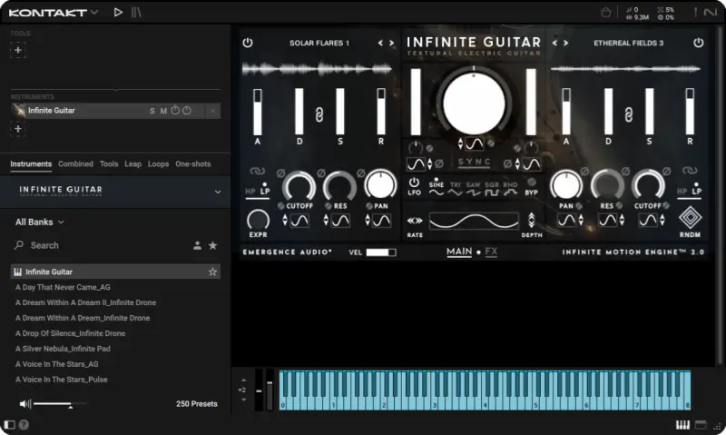Emergence Audio Infinite Guitar 是一款面向现代音乐制作的高级吉他虚拟乐器音色库,专为 Kontakt 平台(需要完整版 Kontakt)设计。它的核心定位是 可无限延展的吉他贴奏与氛围构建工具,把电吉他音色与动态合成、效果处理、空间声场与性能表达结合起来,让吉他在传统吉他之外可用于现代电影配乐、氛围音乐、电子/融合音乐、sound design 等多种场景。