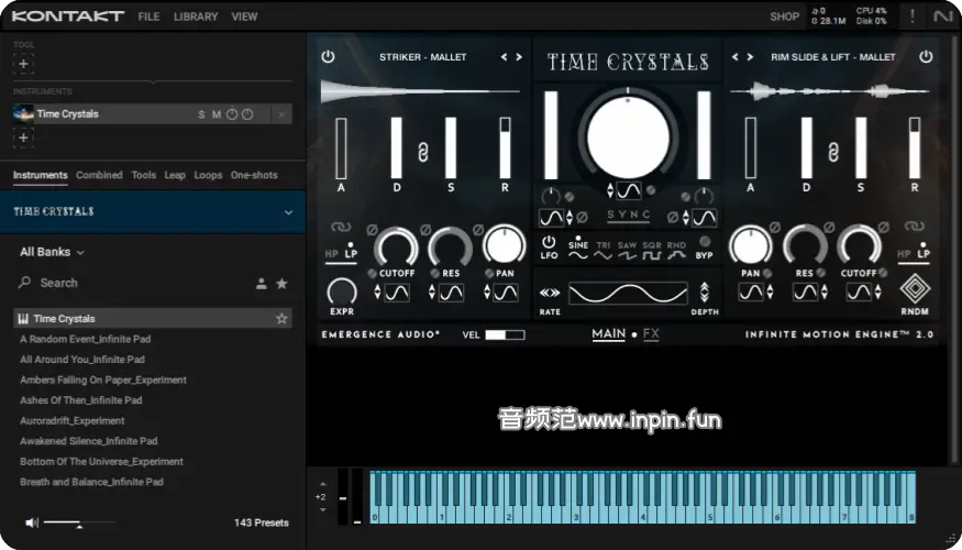 无限运动引擎2.0(Infinite Motion Engine™ 2.0):采用生成式合成方法,允许声音实时进化。内置LFO、自动化控制和超过100个可自定义参数,用户可以轻松塑造声音的运动、纹理和深度。