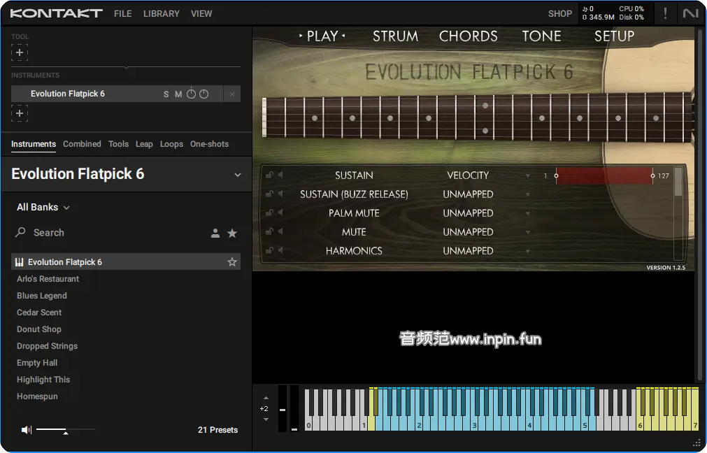 Evolution Flatpick 6 采样库包含所有关键的演奏技法,如延音、自然泛音、闷音、完全闷音音符,以及连奏(击弦、勾弦、滑音)等。此外,还包括敲击延音、琴体敲击等实用的表现技巧。
