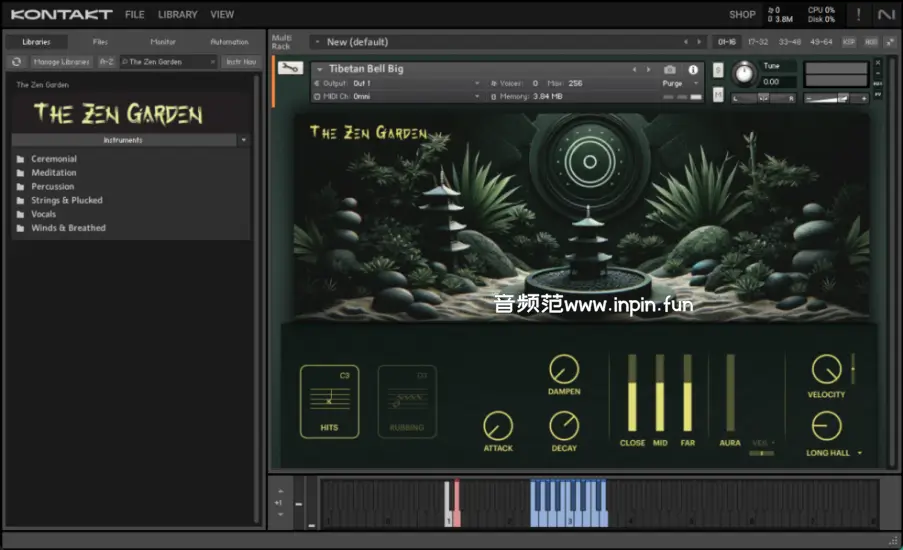 The Zen Garden 旨在为作曲家和声音设计师提供一个灵感丰富的工具,帮助他们快速创建沉浸式的、富有情感的音景。采样库的重点是“自然和谐”,适用于那些希望创作平静、放松音乐的人,例如:瑜伽音乐、冥想音乐、背景环境音、以及电影和游戏中的抒情片段。