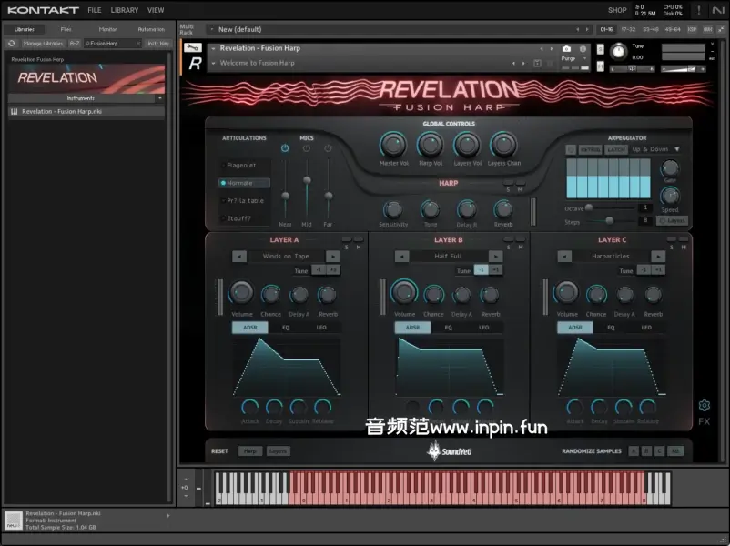 - Revelation Fusion Harp 采用双层音色引擎,允许用户同时加载两个不同的音色层。每一层都可以独立调节参数,甚至进行复杂的交叉调制。这种设计大大增加了音色的灵活性和表现力。