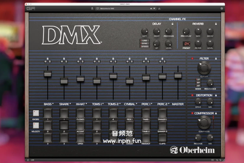 - DMX 精确模拟了 Oberheim DMX 鼓机的每个声音通道,包括基础鼓声(kick、snare、tom)、打击乐器(hi-hat、cymbal)等,以及其特有的模拟音色特征。