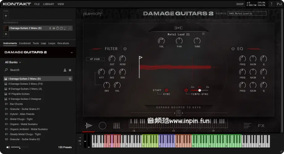 - Damage Guitars 2 提供了超过 1000 种高质量的吉他音色,涵盖了从清脆的干净吉他音色到饱满且极具侵略性的重型失真音色。