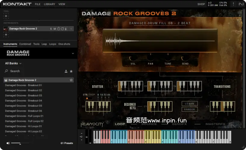 - 除了标准的鼓和打击乐音色外,Heavyocity还加入了合成器、电子音效和音色设计元素,创造出一种极具冲击力和独特感的音响。