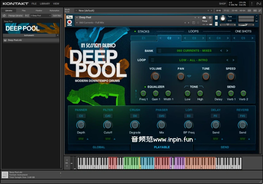 - 创新的音色设计:Deep Pool 强调音色的深度和广度,从低音到高频覆盖了全面的频谱范围。音源库中的 loop 和 sample 带有丰富的延迟、混响和其他效果处理,使得它们在混音中能独立成形,同时也能轻松融合到复杂的音景中。