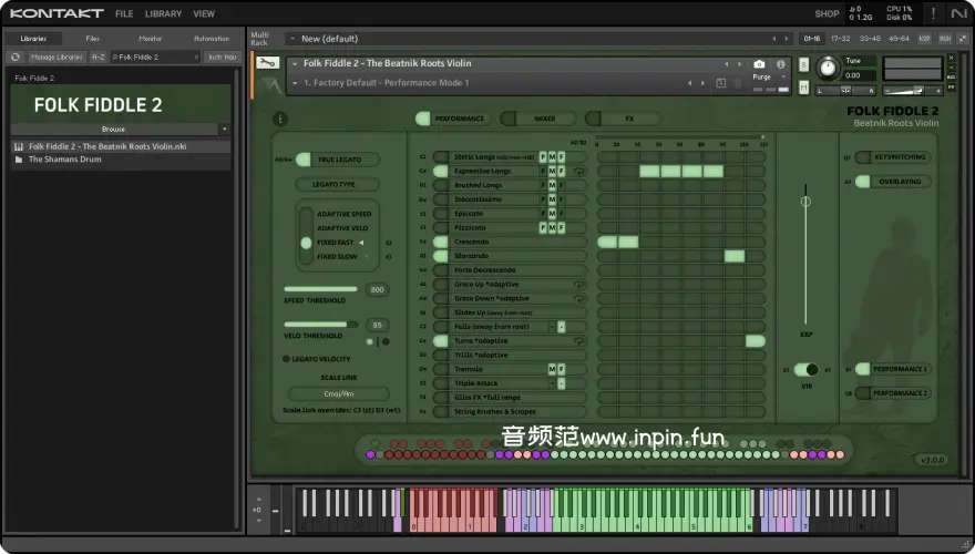 - Folk Fiddle 2 采用先进的连奏算法,结合滑音(Portamento)与手动速度控制,打造细腻流畅的旋律表现。