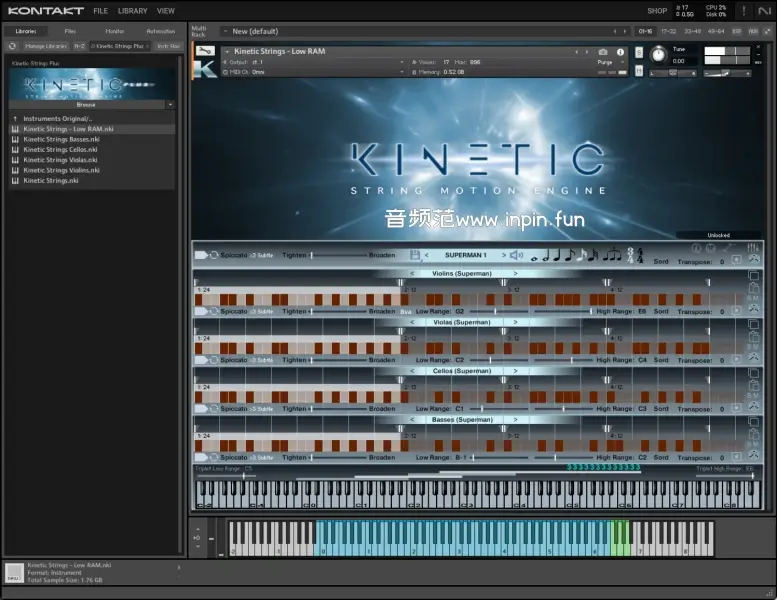 Kinetic Strings Plus 包含了多个多重采样的高品质弦乐音色,包括小提琴、中提琴、大提琴、低音提琴四个弦乐组。每一个音符都进行了精细采样,保留了真实乐器的丰富细节。