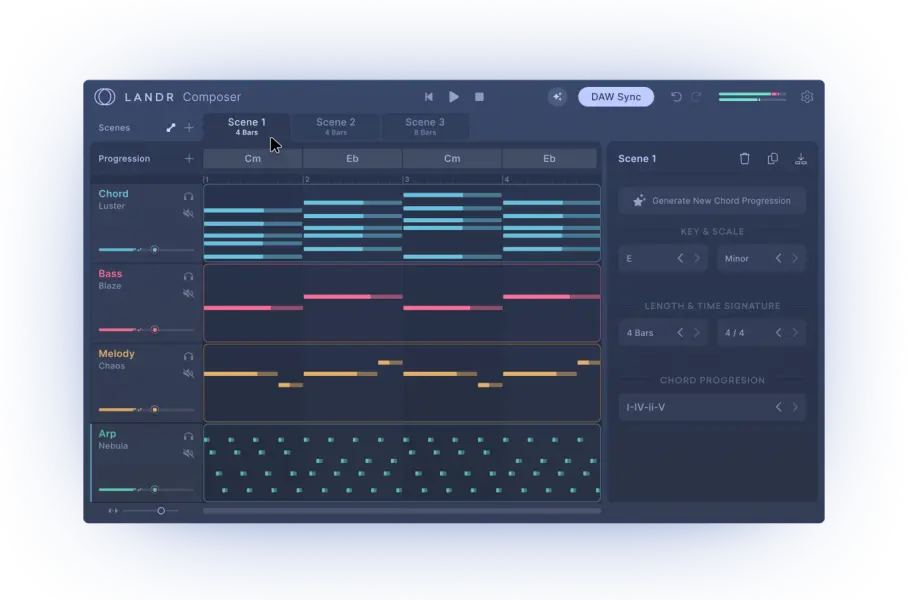 LANDR Composer 利用人工智能算法,根据用户的输入生成多样化的音乐片段和伴奏。这种技术可以帮助音乐创作者快速获得创作灵感,无需具备深厚的音乐理论或作曲技能。