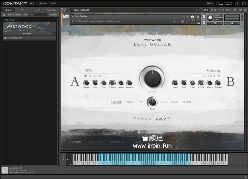 Westwood Instruments 的 Lost Guitar 是一款独特的虚拟乐器插件,旨在为音乐制作人和作曲家提供一种富有情感和氛围感的吉他音色。该插件采样自一把老旧的吉他,并通过多种演奏技巧和音色处理,捕捉到了其独特的音质和个性。