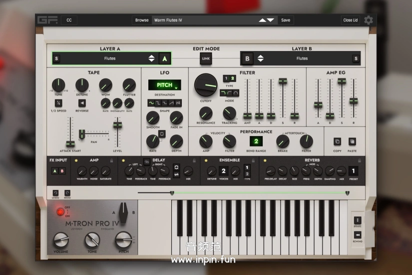 - M-TRON PRO IV 提供了对经典Mellotron音色的精准仿真,包含大量原始Mellotron磁带库。