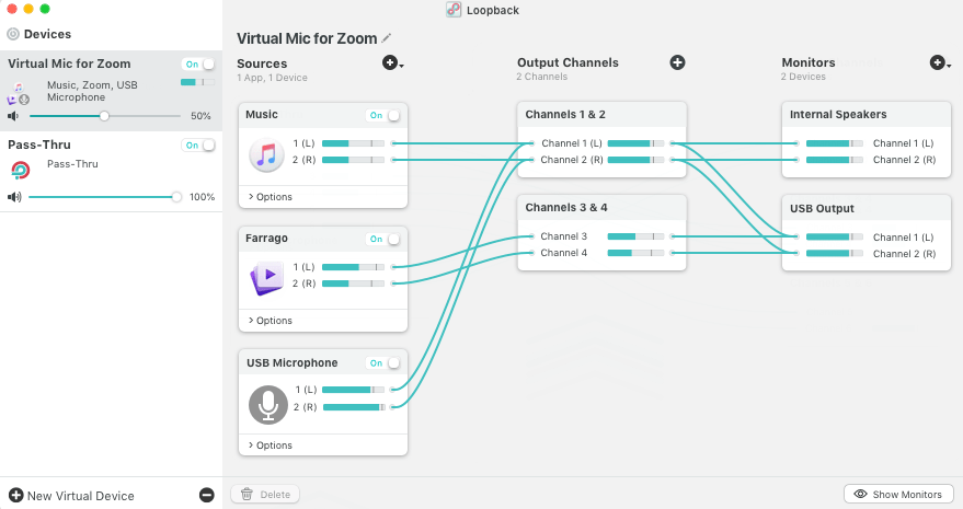 - 组合硬件设备 - 库乐队,逻辑和Ableton Live等应用程序只能一次从单个音频设备录制。值得庆幸的是,他们提供来自许多频道的录音。使用 Loopback,您可以将多个输入设备组合到一个虚拟设备中,以便于录制。