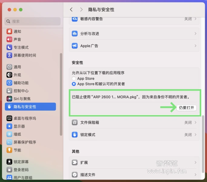 2.依次打开系统设置—隐私与安全—找到 安全性 ,往下滑有一条提示信息 ,点击仍要打开