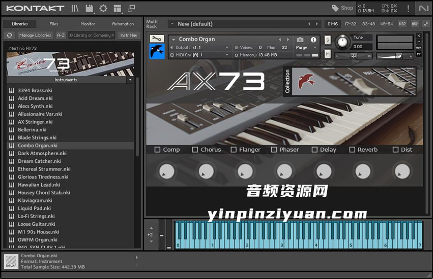 - 32 个强大的 Kontakt .nki 乐器预设- 八个“外部”(后合成器)效果单元模仿马丁尼克 AX73中的 FX 链