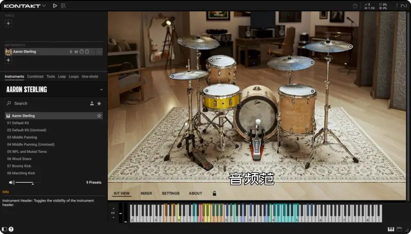 采样来自 Aaron Sterling 个人使用的复古与精品鼓组,包括多种 kick、snare、tom 和 cymbals。