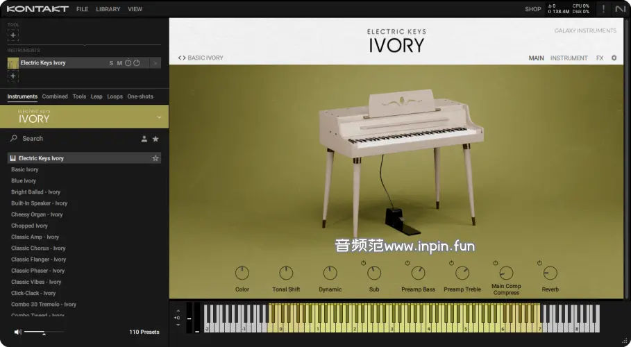 复古电子簧片钢琴音色:Ivory 模拟了一台经典的电子簧片钢琴,采用电子管驱动,音色温暖、充满灵魂感,适合爵士、布鲁斯和抒情曲风。