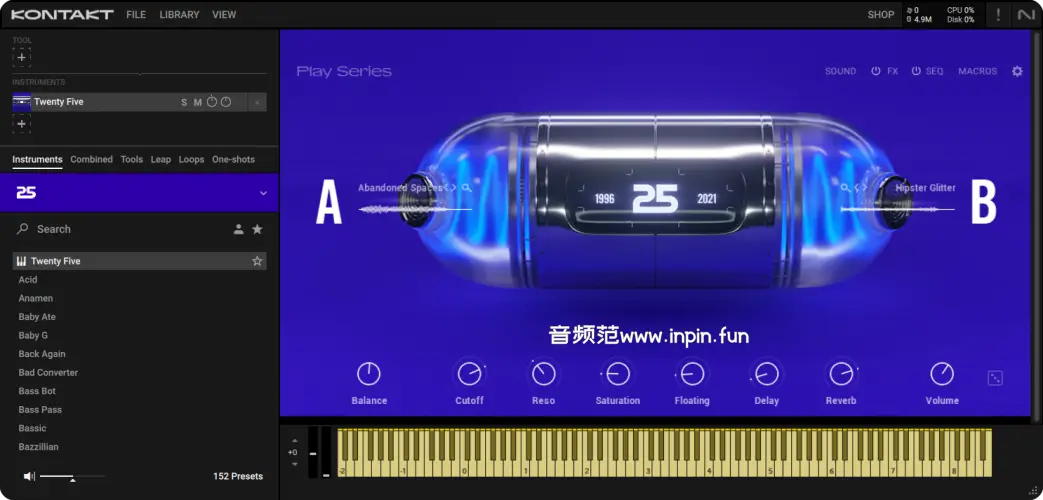 Twenty Five 预置了大量预设,涵盖了从复古合成器到现代电子音色等多种风格。每个预设都包含 A/B 变体,方便用户在演奏和制作过程中切换音色。Native Instruments 在每一个预设中都融合了该品牌历史音色的经典元素,同时赋予它们新的生命力,非常适合希望在作品中融入经典氛围与现代感的音乐人。