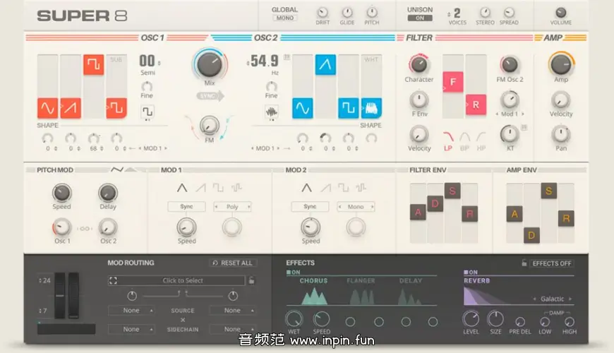 振荡器具备调谐、混合和同步功能,可模拟Unison和Cross Mod等老合成器特性。