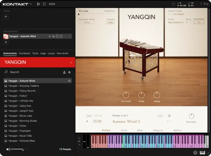 NI 在中国进行录音采样,力求还原扬琴的“竹质 + 金属弦”混合共鸣质感。官方词条中就写:“unmistakable sound of bamboo and steel” (竹与钢的声音混合) native-instruments.com+1 -