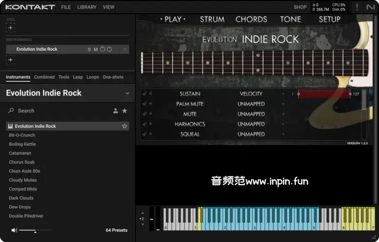 Evolution Indie Rock 采用经典 Fender Telecaster 吉他进行录音采样。Telecaster 以其清晰的中高频和明亮的音色著称,非常适合用于独立音乐和摇滚风格。每根弦的音符都被逐一采样,并包含多种演奏力度、连奏、滑音等丰富细节,让音色听起来更加真实。 - 多种演奏技法支持