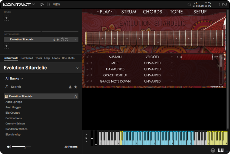 • 利用内建的 strum 编辑器和 mapping 系统,可以设定复杂的拨弦 / 扫弦型演奏逻辑,从而模拟更真实的电 sitar / 吉他演奏动态