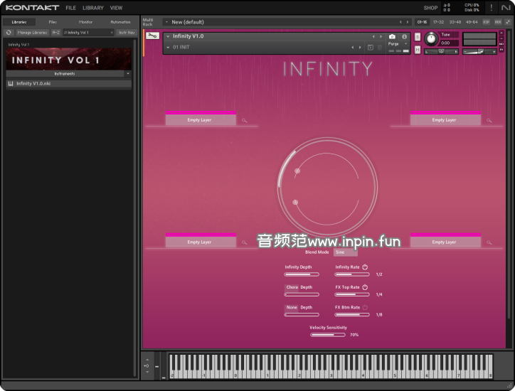 Infinity 旋钮: 位于界面中央的 Infinity 旋钮允许用户在四个层之间进行交叉渐变,创造动态变化的声音纹理。