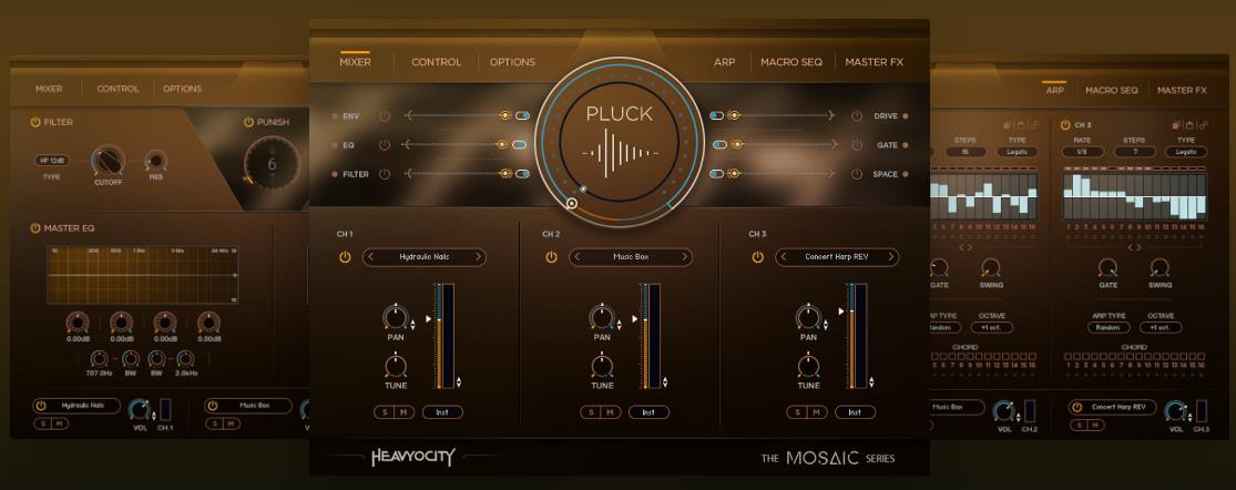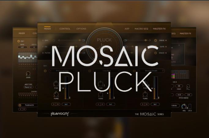 Heavyocity 的 Mosaic Pluck 模拟合成器 VST 插件具有一系列弹拨源(包括合成器、弦乐、竖琴、加工过的编钟和拇指钢琴),甚至可以切割最密集的乐谱混音。